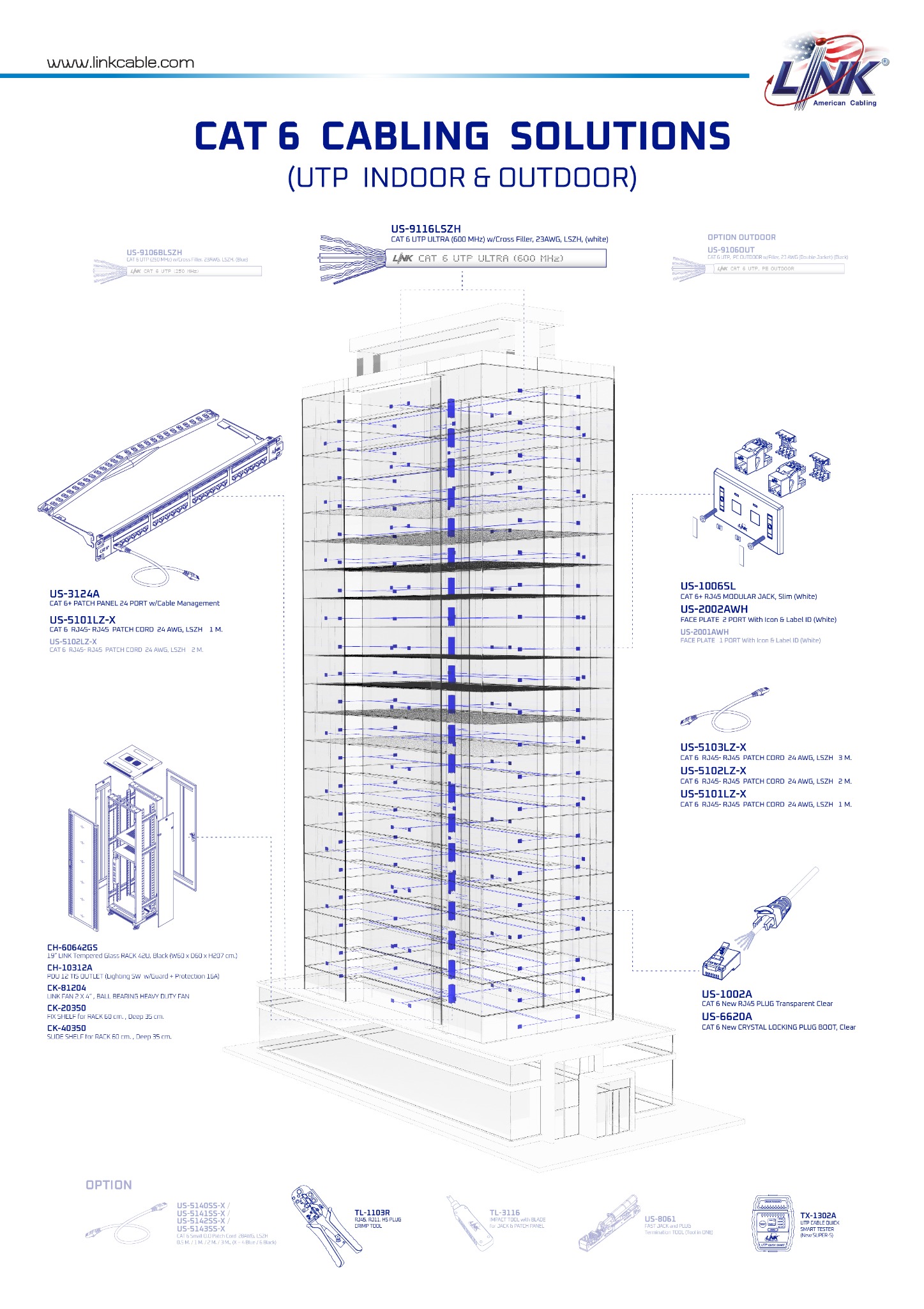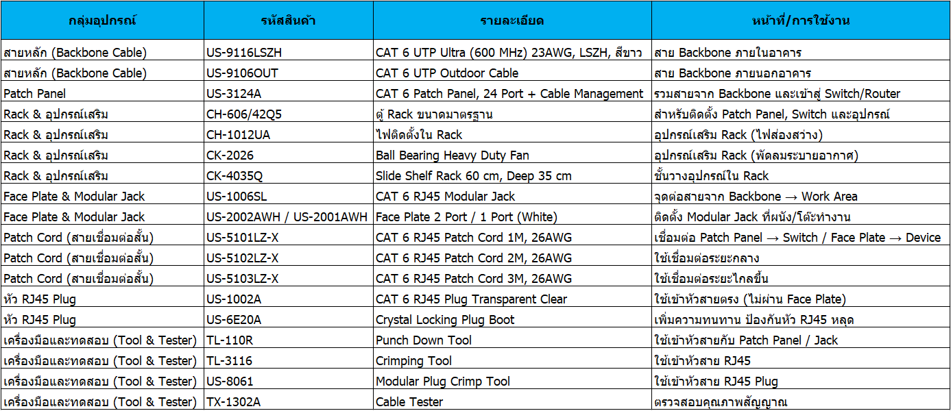 ใช้สาย US-9116LSZH (CAT 6 UTP Ultra 600 MHz, LSZH, White) เดินภายในอาคารเป็น Backbone